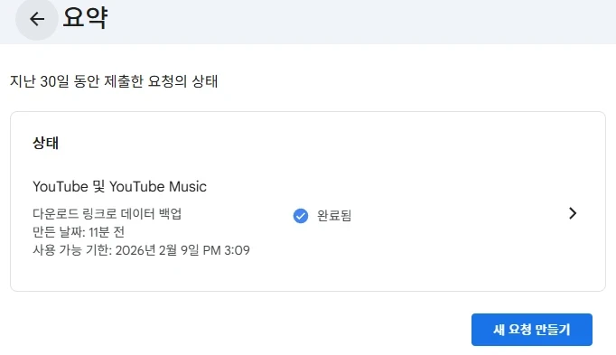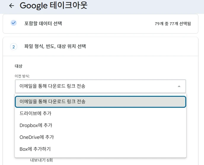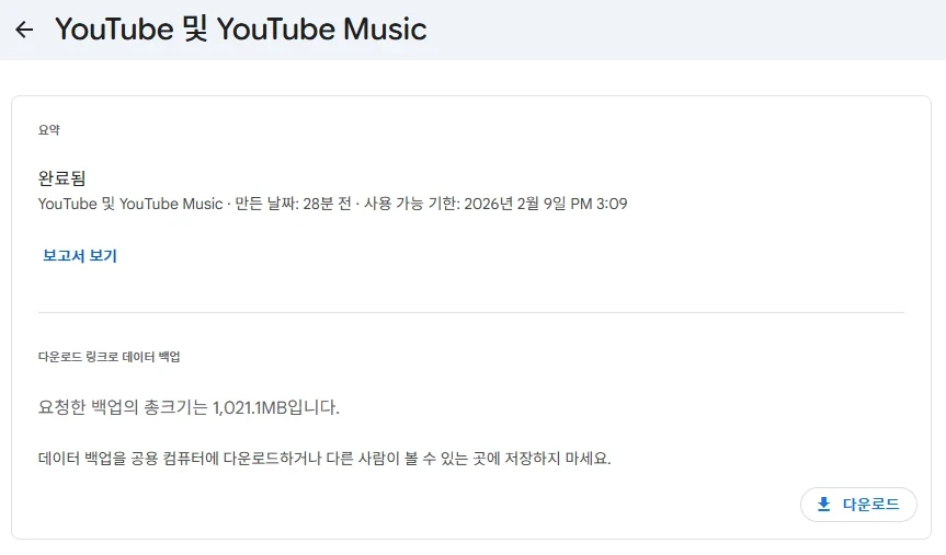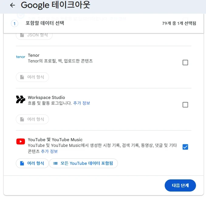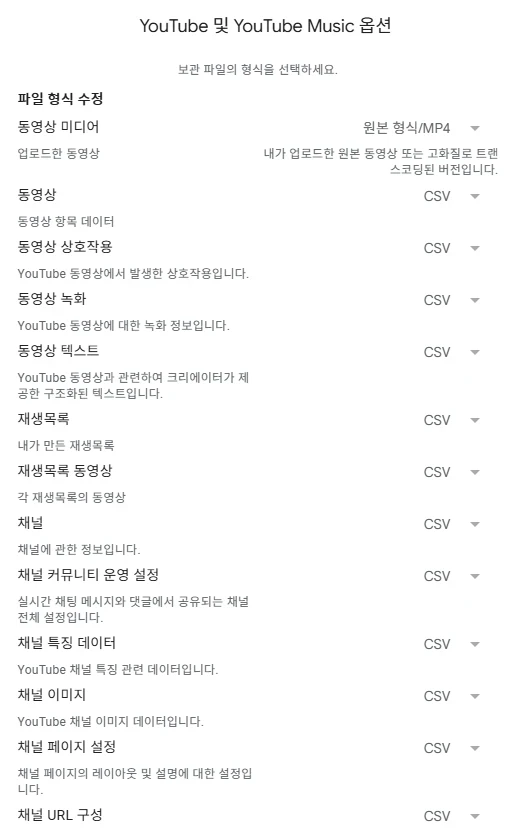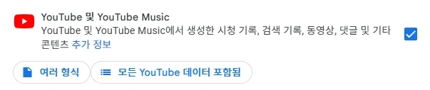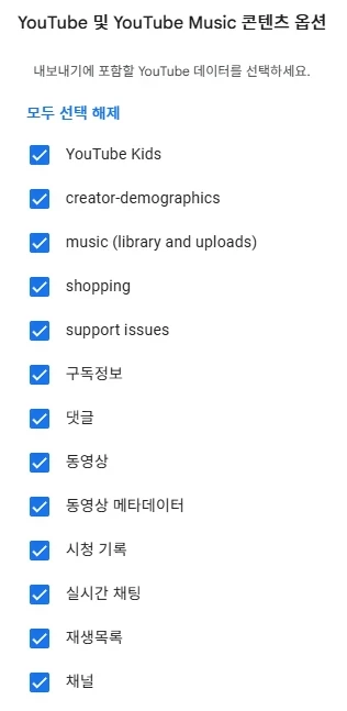 아래와 같이 내 계정의 내 데이터 콘텐츠 사본을 내보내 백업하거나 외부에 사용 할 수 있는 서비스를 의미 합니다. 저와 같이 유튜브 및 유튜브 뮤직은 최 하단에 선택할 수 있는 항목이 있습니다.