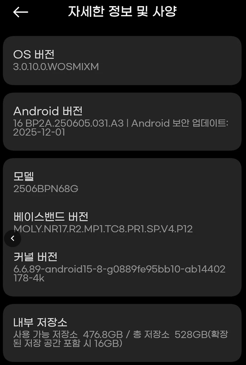 초기 전원을 켰을 때 마주한 것은 HyperOS 2.0이었으나, 곧이어 3.0 버전 업데이트 알림이 도착했습니다. 안드로이드 16 기반으로 추정되는 이 대규모 업데이트는 압축을 풀고 설치하는 데 꽤 긴 시간이 소요되었습니다. 화면이 멈춘 듯한 순간에도 조급해하지 않고 기다림을 택한 것은, 개발자로서 OS 판올림이 갖는 중요성을 이해하고 있기 때문일 것입니다. 이 과정에서 겪은 RCS 문자 메시지 활성화 문제는 한국의 통신 환경과 외산 기기 사이의 미묘한 불협화음을 보여주었습니다. 여러 설정과 앱 데이터 초기화를 시도했으나, 결국 복잡한 기능을 억지로 활성화하기보다 SMS라는 기본 기능에 만족하는 쪽으로 타협점을 찾았습니다. 불필요한 연결을 끊어내고 단순함을 택하는 것, 이 또한 이번 기기 변경의 목적과 맞닿아 있는 듯합니다.