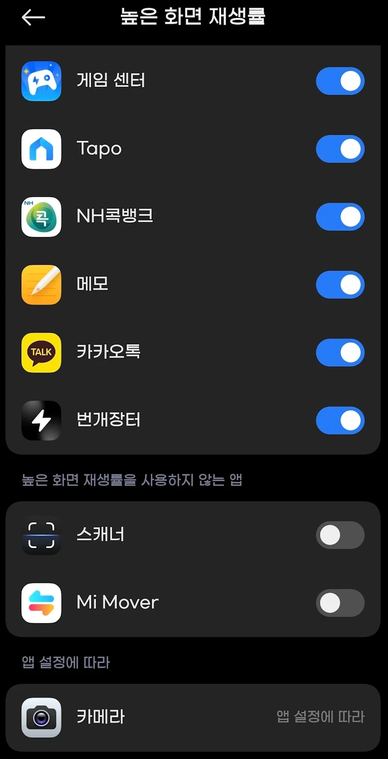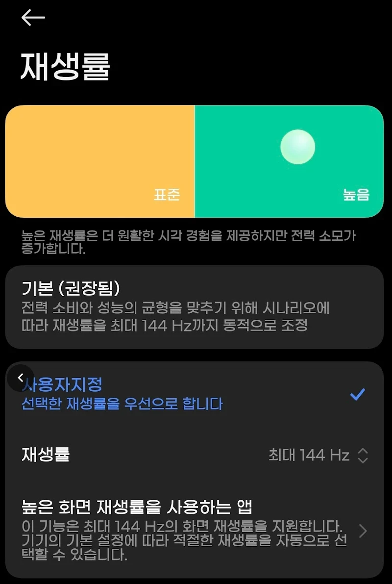 144Hz라는 높은 주사율을 가진 하드웨어임에도, 배터리 효율을 중시하는 소프트웨어 정책 탓에 스크롤이 끊겨 보이는 현상이 관찰되었습니다. 특히 유튜브와 같은 특정 앱에서 프레임이 60Hz로 제한되는 것은 역체감을 불러일으키기에 충분했습니다. 이를 해결하기 위해 시스템 설정에서 강제로 최고 주사율을 지정하는 과정이 필요했습니다.설정 > 디스플레이 > 주사율 > 앱별 주사율 설정 YouTube 및 브라우저 > 144Hz 강제 지정이 설정을 마친 후에야 비로소 화면은 손가락의 움직임에 즉각적으로 반응하기 시작했습니다. 배터리 소모는 다소 늘어나겠지만, 시각적인 부드러움을 확보하는 것이 사용자 경험에 더 긍정적인 영향을 미친다고 판단한 듯합니다.