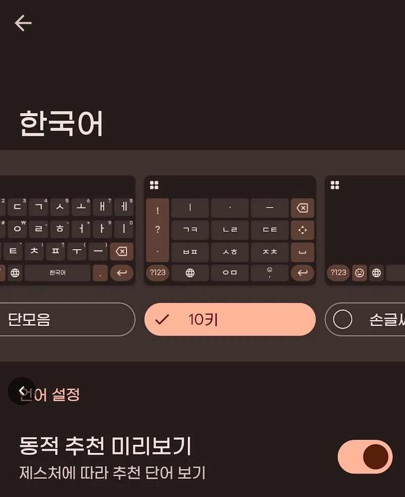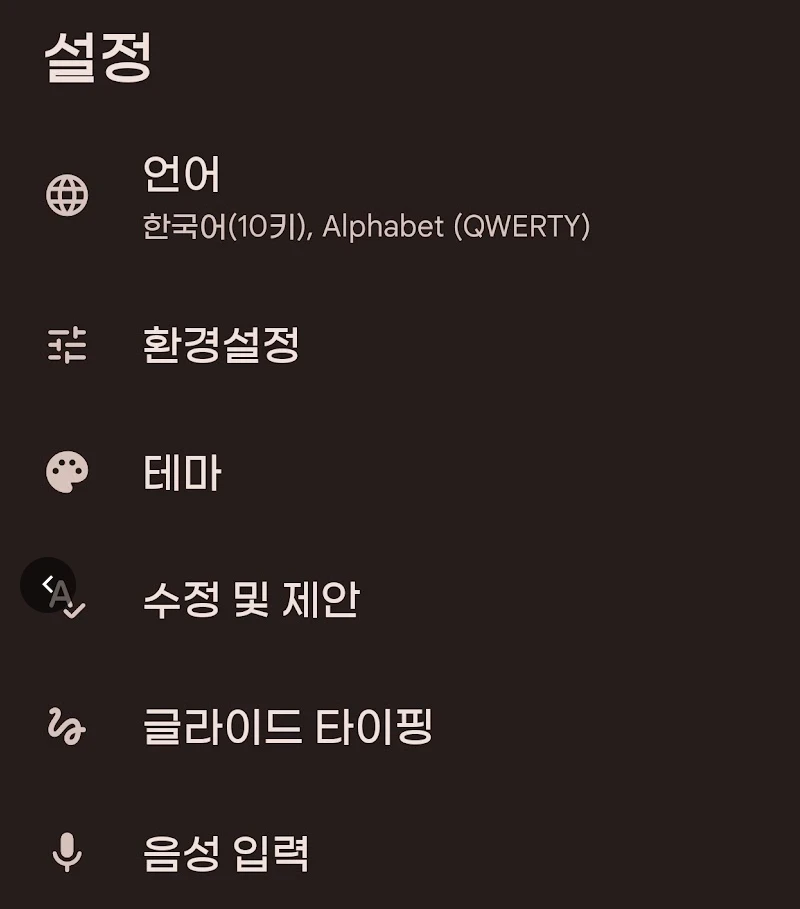 외산 폰을 사용할 때 가장 피부로 와닿는 변화는 입력 방식입니다. 익숙했던 네이버 스마트보드를 설치했으나, 미세한 진동 피드백 설정이 제대로 작동하지 않는 문제가 발견되었습니다. 타이핑의 리듬감을 중요시하는 사용자에게 이는 타협하기 어려운 부분이었을 것입니다. 결국 구글의 Gboard가 대안으로 선택되었습니다. 10키 배열 사용 시 하단 공백이 좁아 오타가 발생할 수 있는 구조적 낯설음이 있지만, 입력 딜레이가 없고 햅틱 반응이 명확하다는 점이 장점으로 작용했습니다.Gboard 설정 > 언어 > 한국어 > 10키 배열 선택 설정 > 텍스트 수정 > 자동 수정 비활성화 (오타 방지)다소 불편한 레이아웃은 시간이 지나면 손끝이 기억하고 적응하게 될 영역으로 남겨두었습니다. 기능적인 반응성을 위해 레이아웃의 익숙함을 잠시 유보한 결정으로 보입니다.
