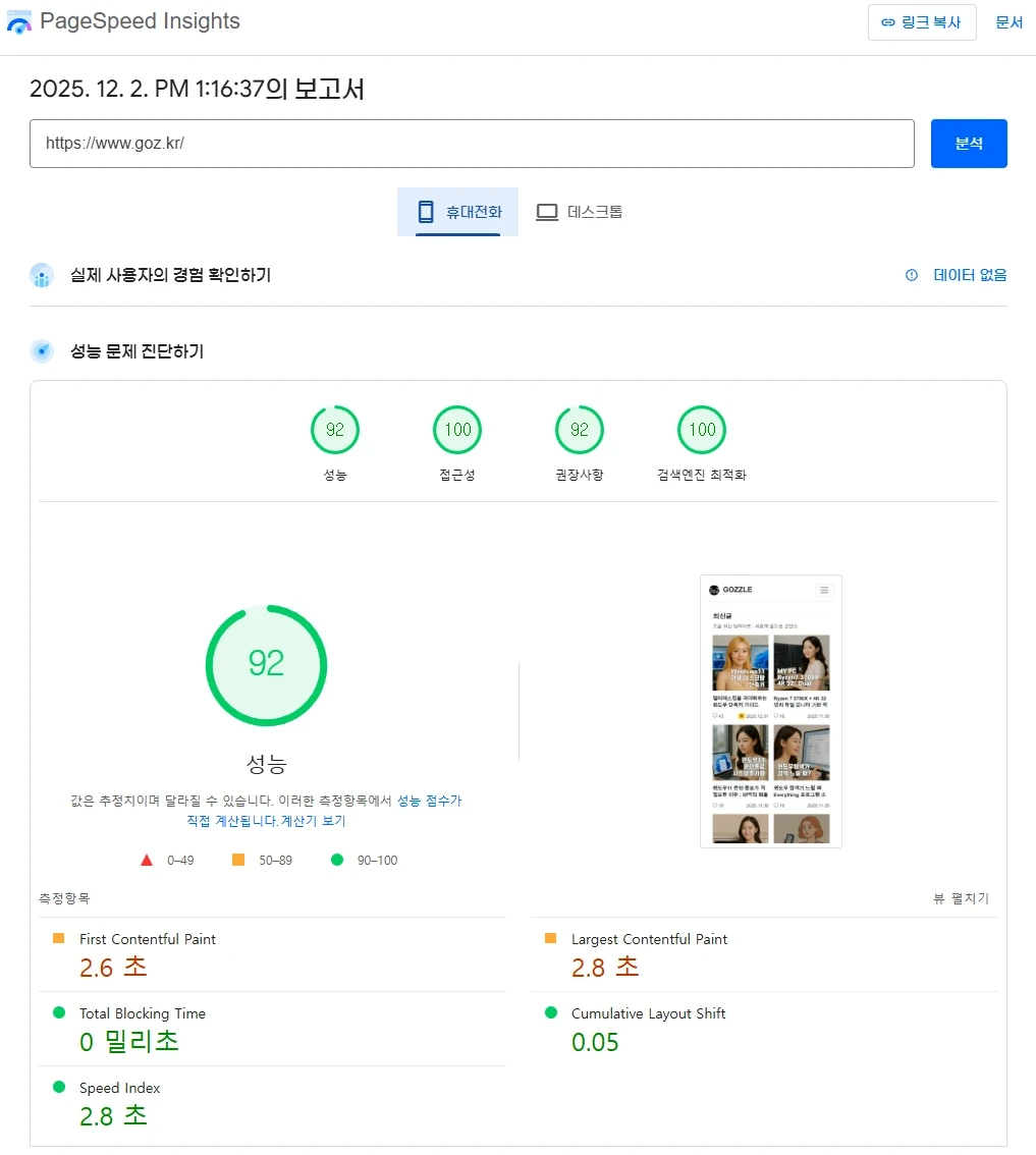 점수는 환경마다 흔들리고 운 요소도 크기 때문에 매번 동일한 결과가 나오지 않는다. 중요한 것은 점수가 아니라 실제 사용자 경험과 사이트의 안정적인 로딩 구조다.