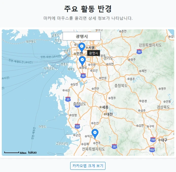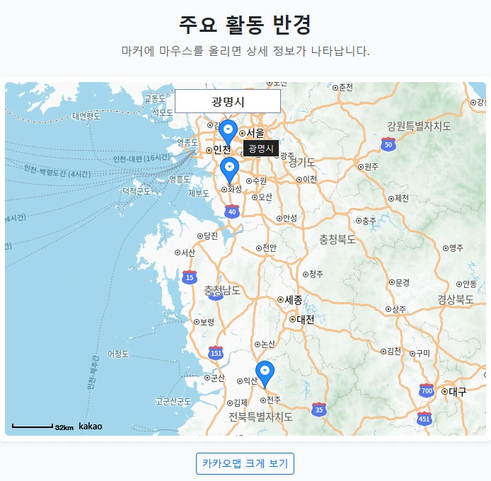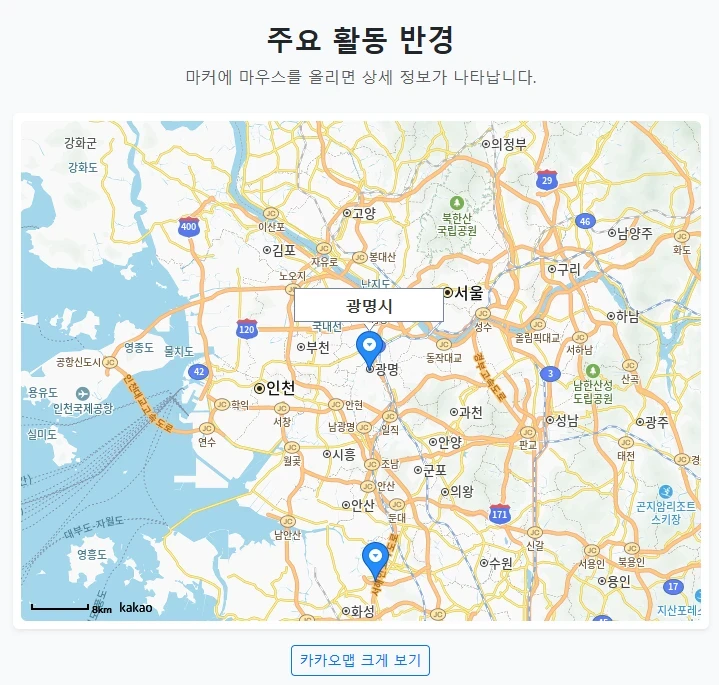 안녕하세요 오늘은 웹사이트에 지도를 넣을 때 가장 많이 사용하는 카카오 지도 API 활용법을 정리해보려 합니다 단순히 위치만 보여주는 것이 아니라 사용자가 마커에 마우스를 올렸을 때 상세 정보가 뜨는 기능을 구현했습니다 디자인은 부트스트랩 5를 적용하여 PC와 모바일 모두에서 깔끔하게 보이도록 만들었습니다