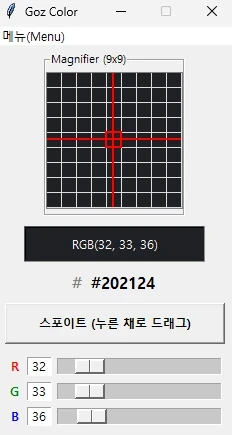 화면의 특정 지점을 정확하게 선택하는 것은 색상 추출 작업에서 가장 중요한 요소입니다. GozColor는 마우스 커서가 위치한 지점을 중심으로 9x9 픽셀 영역을 실시간으로 확대하여 보여줍니다. 확대된 영역에는 픽셀 단위의 그리드와 붉은색 십자선이 표시되어 1픽셀의 오차도 없이 원하는 색상을 조준할 수 있습니다.